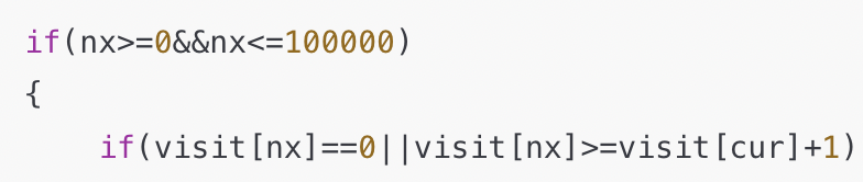 if(visit[nx]==0||visit[nx]>=visit[cur]+1) // !!!!