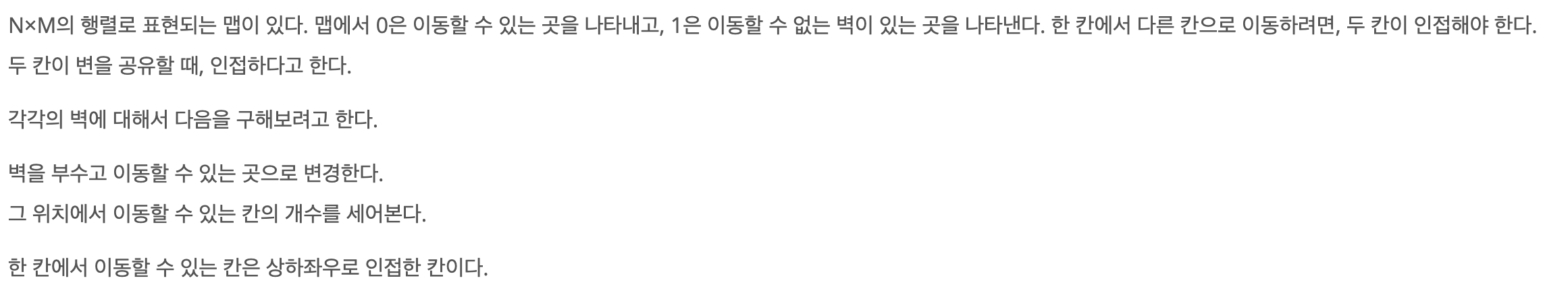 N×M의 행렬로 표현되는 맵이 있다. 맵에서 0은 이동할 수 있는 곳을 나타내고, 1은 이동할 수 없는 벽이 있는 곳을 나타낸다. 한 칸에서 다른 칸으로 이동하려면, 두 칸이 인접해야 한다. 두 칸이