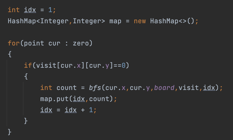 int count = bfs(cur.x,cur.y,board,visit,idx);