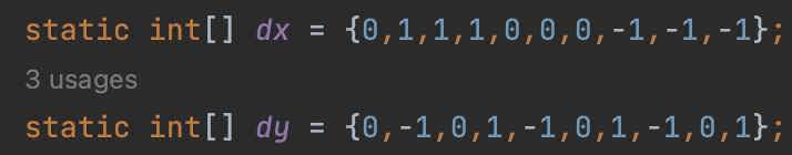 static int[] dx = {0,1,1,1,0,0,0,-1,-1,-1};