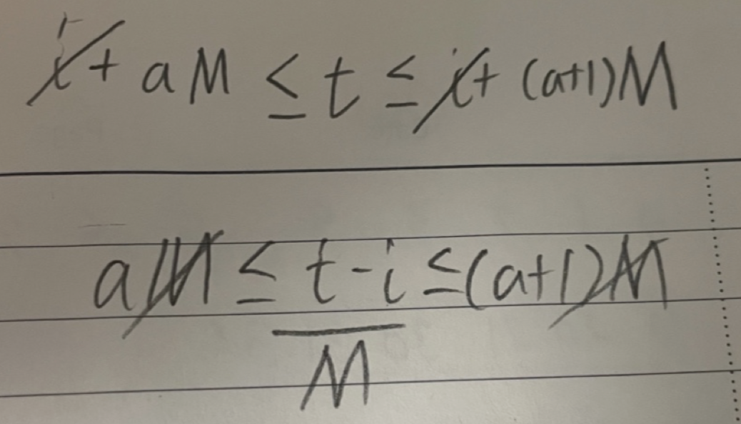 - a (다음 신호 차수) , M( 주기 시간) , i (다음 지점의 지역 번호 : 위 문제에서는 지역 번호에 따라 주기가 다르다)