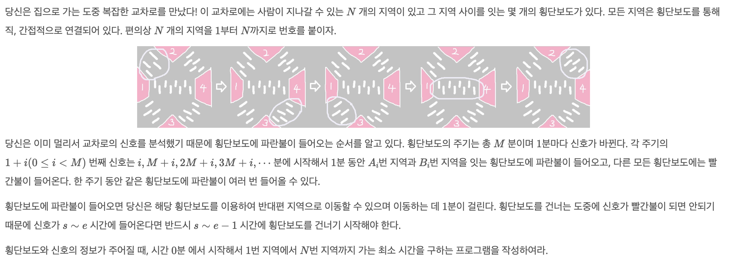 당신은 집으로 가는 도중 복잡한 교차로를 만났다! 이 교차로에는 사람이 지나갈 수 있는 $N$ 개의 지역이 있고 그 지역 사이를 잇는 몇 개의 횡단보도가 있다. 모든 지역은 횡단보도를 통해 직,