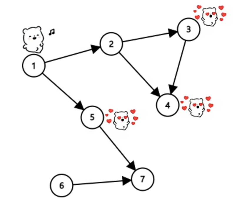 투어리스트 곰곰이는 종종 이 그래프 위에서 여행을 떠난다. 투어리스트 곰곰이의 여행은 1번 정점에서 출발해 간선을 따라서 이동한다. 그러다가 더 이상 간선을 따라서 이동할 수 없는 경우 투어리스트의 여행은 종료된다.